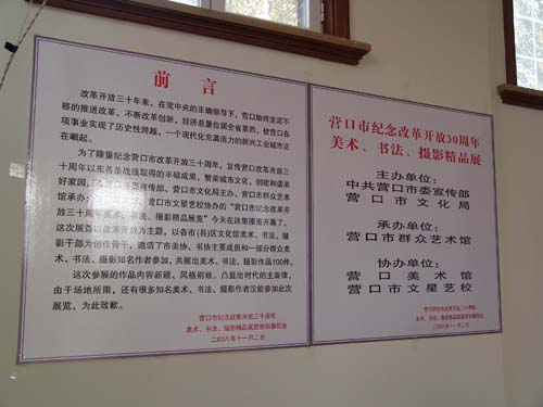 为了隆重纪念营口市改革开放三十周年,宣传营口改革开放三十周年以来各条战线取得的丰硕成果,繁荣城市文化,创建和谐美好家园,由中共营口市委、营口市文化局主办;营口市群众艺术馆承办;营口美术馆、营口市文星艺校协办的“营口市纪念改革开放三十周年美术、书法、摄影精品展览”今天在这里隆重开幕了,这次展览以改革开放为主题,以各市(县)区文化馆美术、书法、摄影干部为创作骨干,邀请了市美协、书协主要成员和一部分群众美术、书法、摄影知名作者参加,共展出美术、书法、摄影作品100件,内容新颖、风格别致,凸显出时代的主旋律.