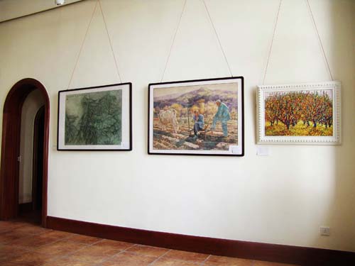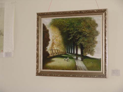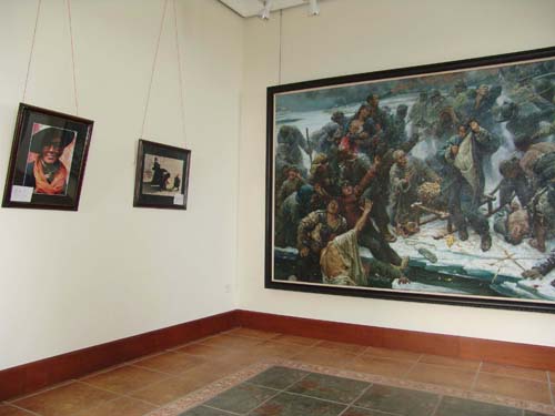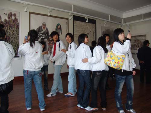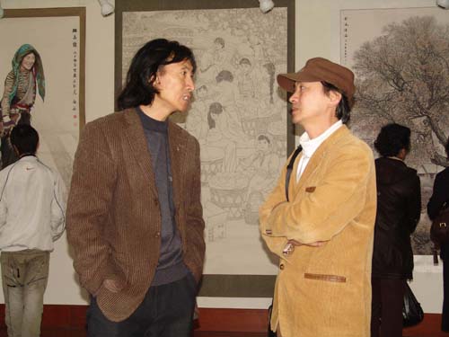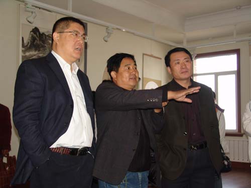 市油画家协会副主席马玉武、市群艺馆副馆长刘世俊观看展览